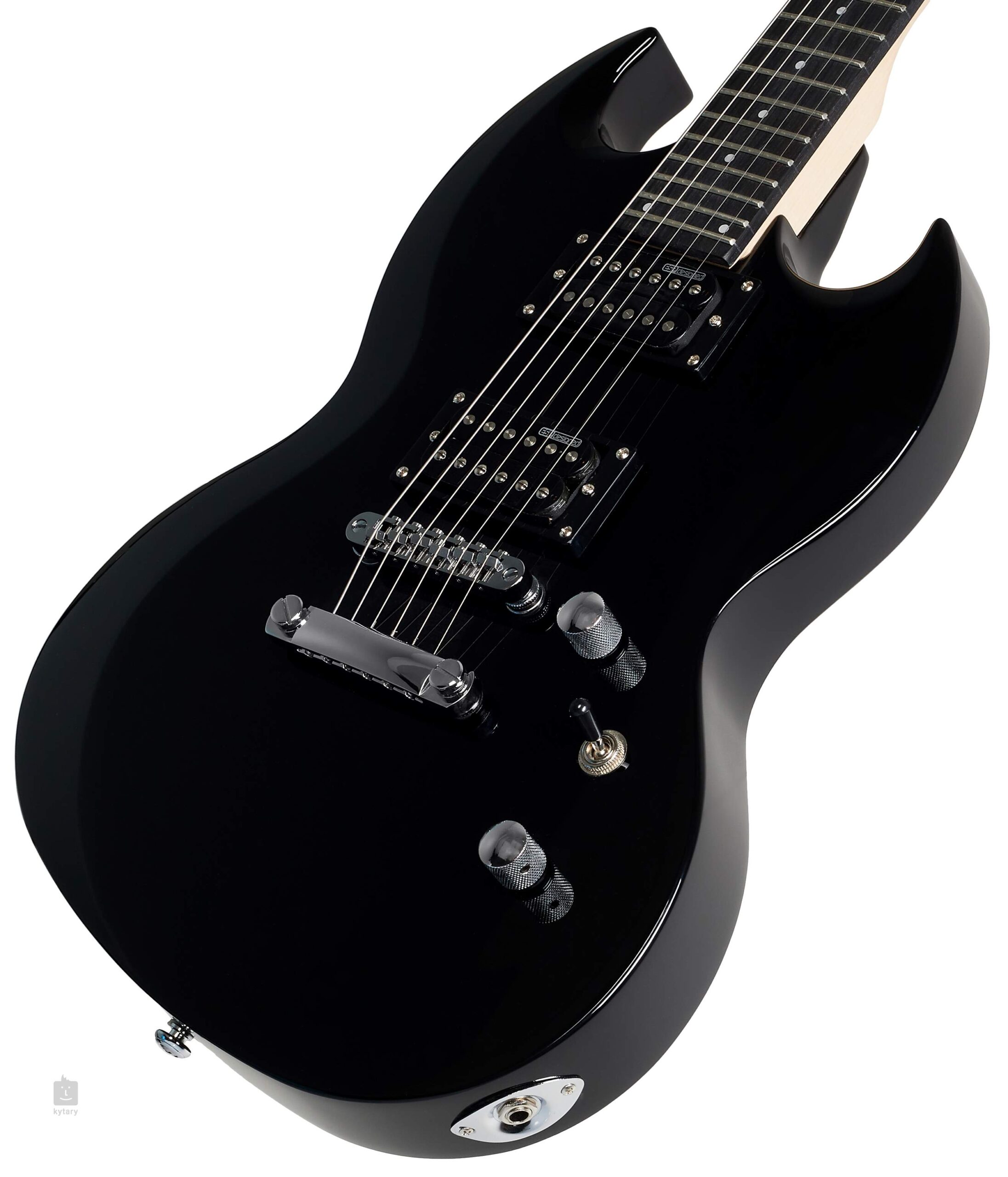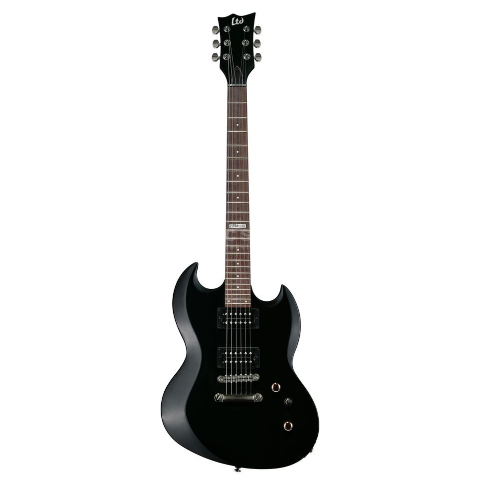 Características de la guitarra ESP LTD Viper-10 BK: cuerpo de agathis mástil atornillado de arce diapasón de palisandro incrustaciones con forma de punto medida: 648mm 24 trastes XJ herrajes niquelados puente TOM puente con conducción de las cuerdas a través del cuerpo 2x pastillas humbucker LTD reguladores: 1x volumen, 1x tono interruptor de 3 posiciones acabado: negro